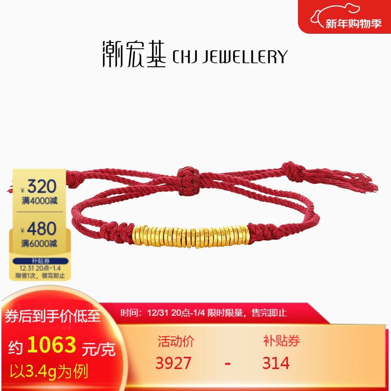 潮宏基盘缠金足金黄金手链本命年送妈妈送女友生日礼物计价 约3.4g