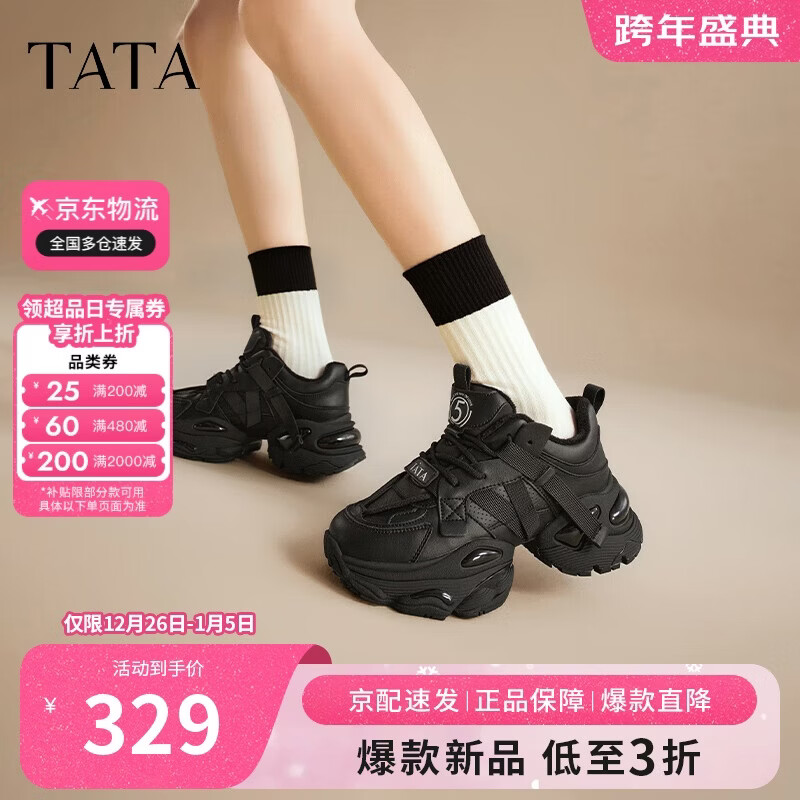 他她厚底休闲老爹鞋女鞋机能加绒休闲运动鞋GEA01CM4黑色(绒里) 38