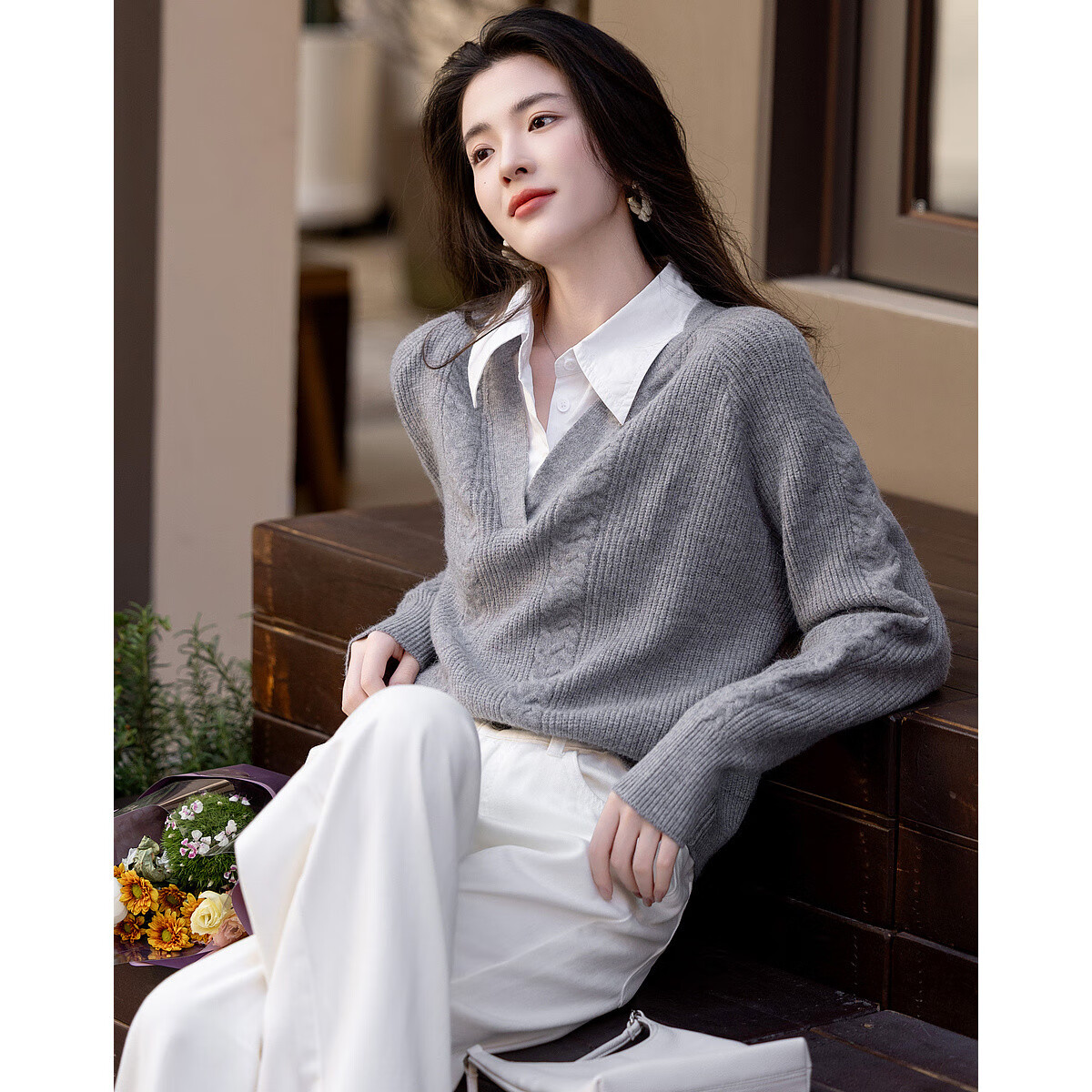 德玛纳【云朵线衫】春秋简约风通勤拼接翻领舒柔纤绒纱遮肉针织衫女上衣