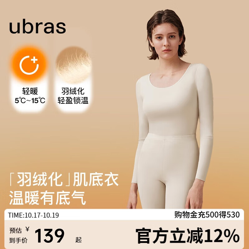 ubras新柔暖羽绒化肌底衣套装女保暖秋衣秋裤情侣打底轻暖-燕麦奶XL