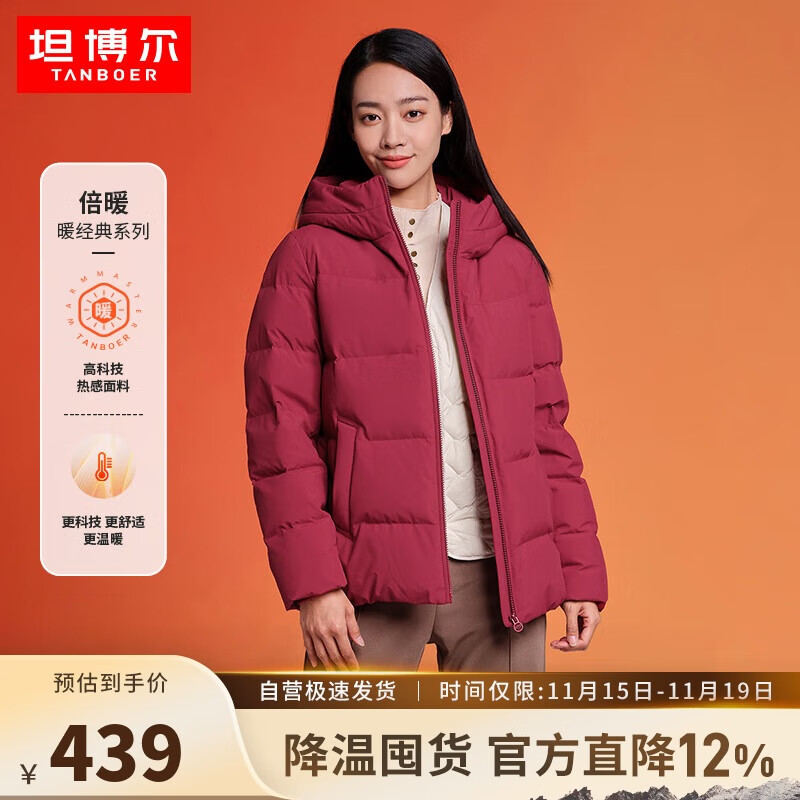 坦博尔羽绒服女短款秋冬连帽宽松保暖女士外套厚TD236356 酱紫红 170