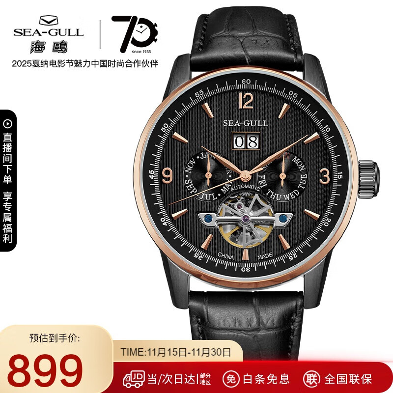 海鸥(SEAGULL)手表男自动机械表 日历周历月历镂空飞轮男士手表生日礼物男表 黑
