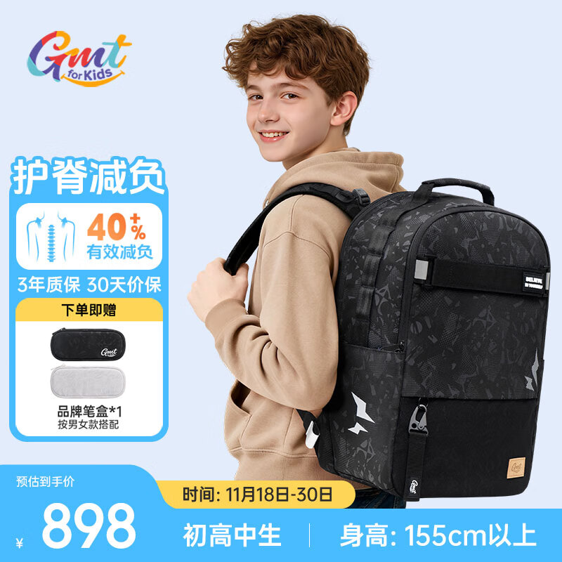 Gmt for kids初中高中生书包小学生大容量背包护脊双肩7-12年级男黑Trend pro