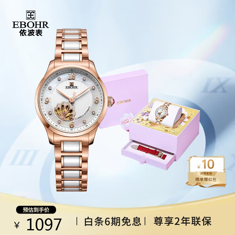 依波(EBOHR)手表女 贝壳镂空女士机械表生日节日礼物礼盒50690121送女友