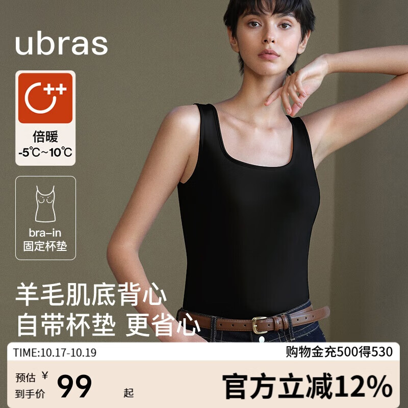 ubras羽绒化羊毛背心修身保暖肌底衣女秋冬锁温打底内搭 漆黑色S