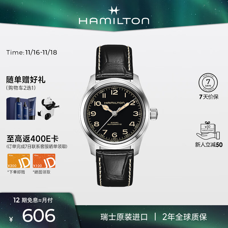 汉米尔顿(Hamilton)汉密尔顿墨菲38黑盘皮带机械表男士手表女士瑞士手表名表轻奢