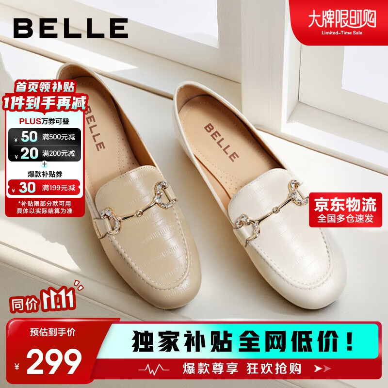 百丽羊皮英伦风乐福小皮鞋平底豆豆女复古深口单鞋A7H1DAA4 米白 38