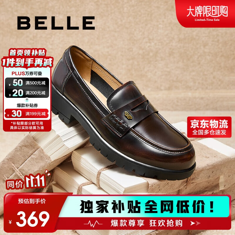 百丽2025复古英伦风真皮乐福鞋小皮鞋牛皮女单鞋子B2561AA5 棕色 38