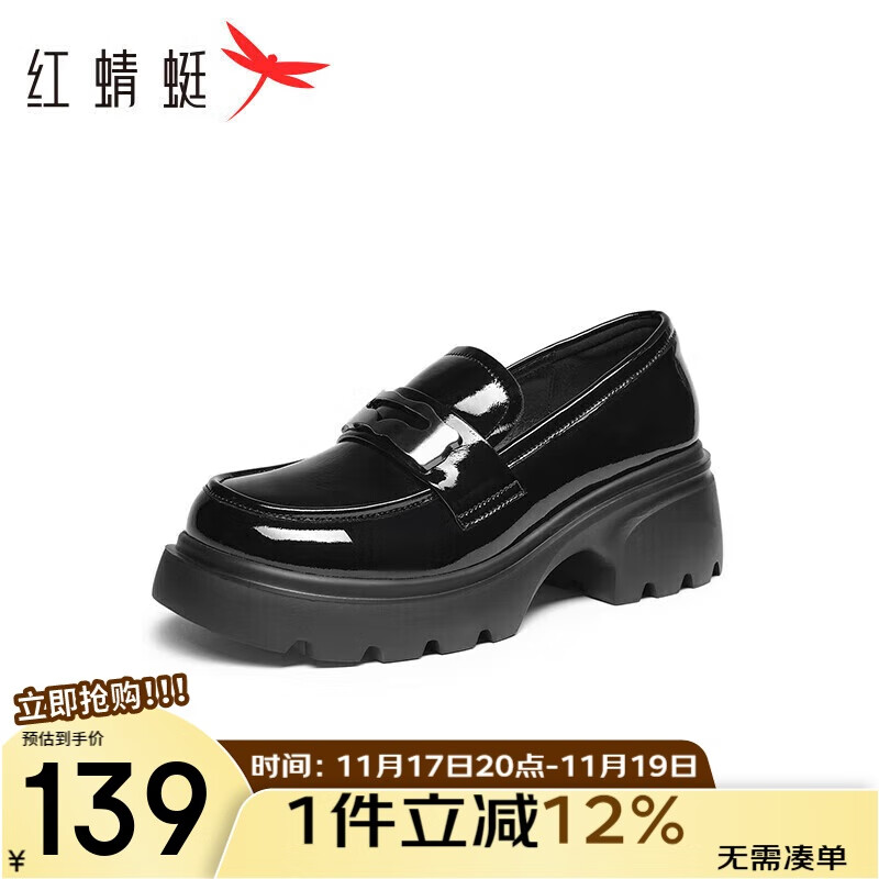 红蜻蜓春秋季厚底时尚通勤乐福鞋学院风女单鞋小皮鞋WBB34401 黑色 37