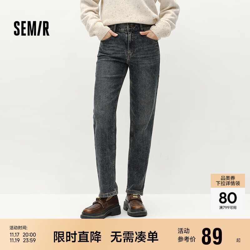 森马(Semir)森柔牛仔|牛仔裤女抓毛长裤女生冬季半松紧腰直筒裤103724124002