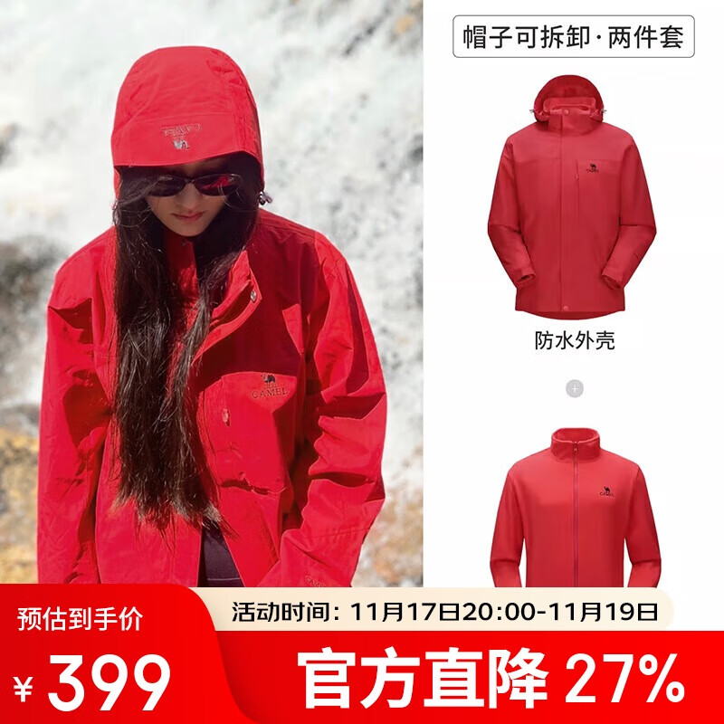 骆驼(CAMEL)冲锋衣男女外套三合一可拆卸两件套户外暴雨级防水防风登山服