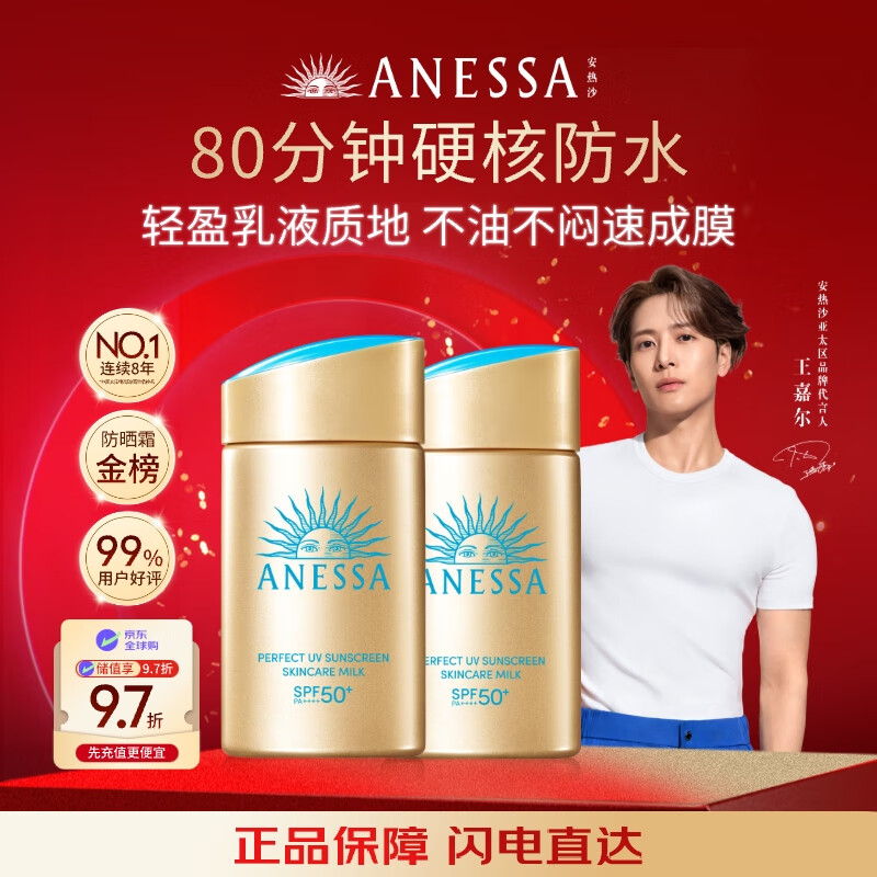 安热沙(Anessa)王嘉尔同款资生堂小金瓶60ml*2安耐晒防晒乳女男军训专用防晒霜
