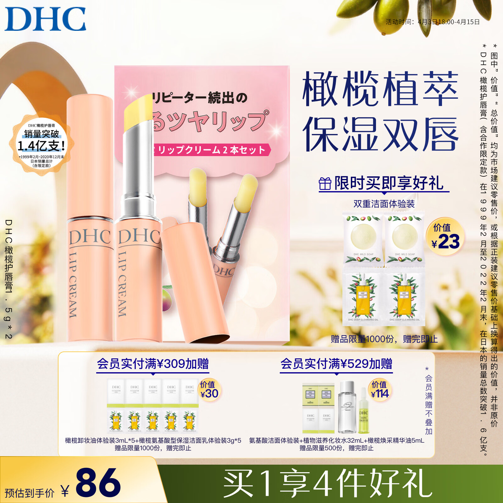 DHC橄榄护唇膏1.5g×2 蝶翠诗润唇膏保湿滋润抗皱温和舒缓修护