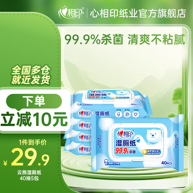 心相印湿厕纸洁厕湿巾 99.9%消毒私处清洁深层温和杀菌可冲马桶卫生湿巾 40片*5包 (新旧包装随机发)