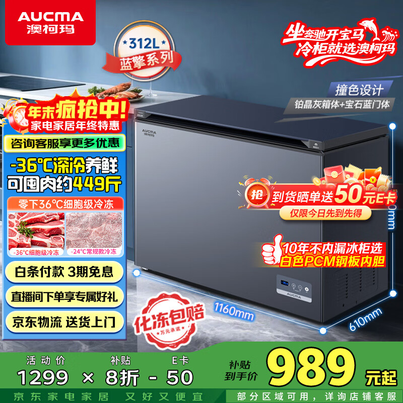 澳柯玛(AUCMA)蓝擎系列312升单温家用减霜小冰柜冷藏柜冷冻柜超低温电控卧式冰箱一级能效 BC/BD-312DHX国家补贴