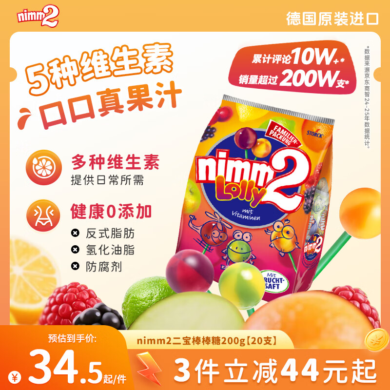 二宝(Nimm2)德国原装进口果汁棒棒糖20支200g多种口味多维生素儿童零食糖果