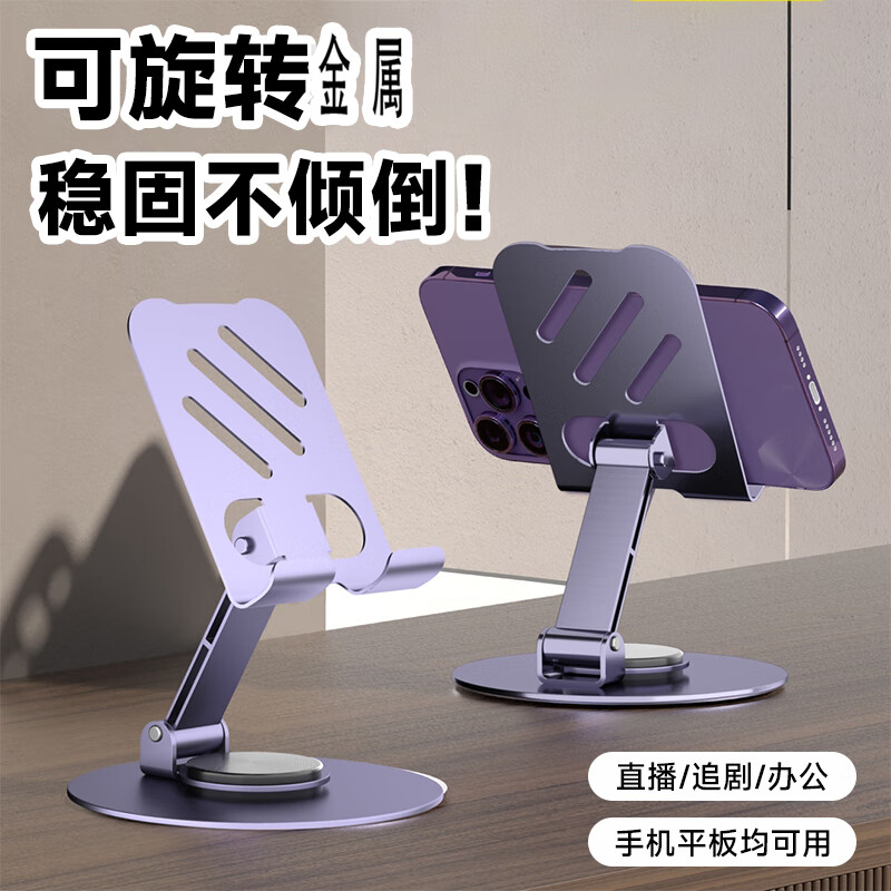 简纽旋转支架手机支架桌面可旋转折叠款直播拍视频追剧刷抖音视频支架床头懒人支架通用手机支架 紫色款--360度旋转一加强碳素钢材质