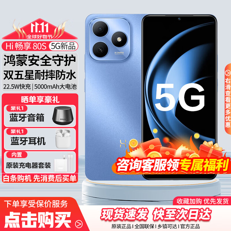 华为 智选 Hi畅享 80S 新品全网通5G手机 鸿蒙安全守护 22.5W快充5000mAh追剧长续航手机 晴空蓝 8GB+256GB 【官方标配】