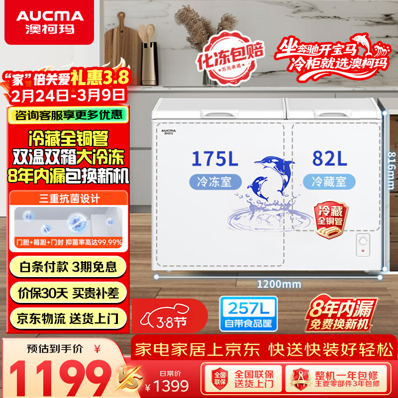 澳柯玛(AUCMA)双温系列257升双箱家用冰柜 冷藏冷冻卧式双门钢板冰箱 冷藏全铜管 一级能效 BCD-257CHN 以旧换新