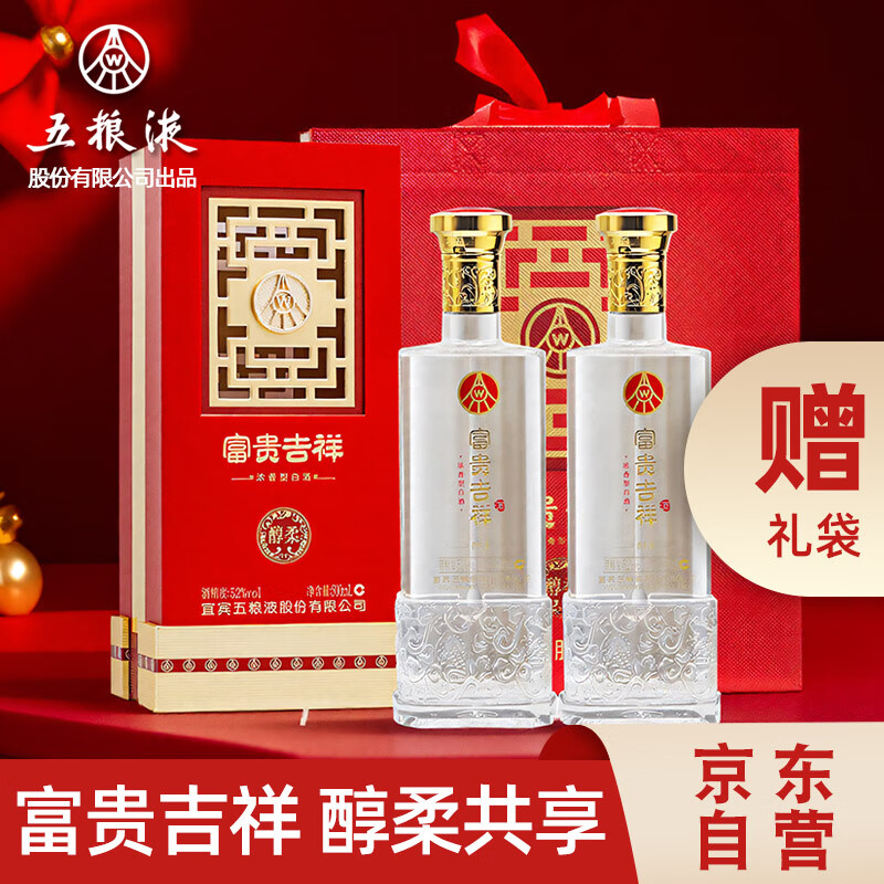 五粮液股份 富贵吉祥醇柔 浓香型白酒礼盒 52度500ml*2瓶礼盒装纯粮酒