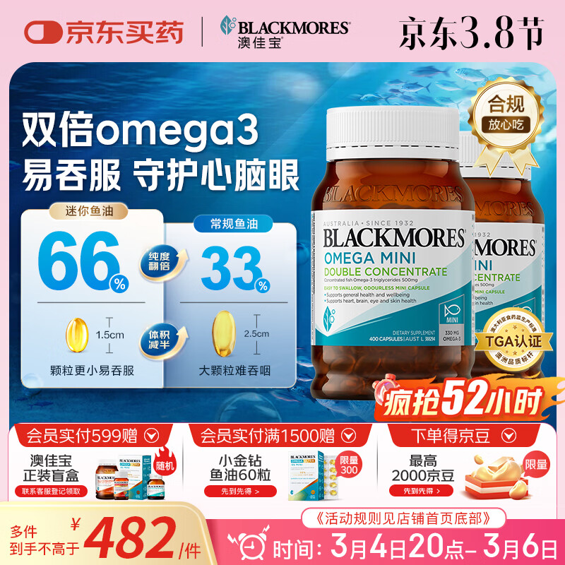 澳佳宝(Blackmores)双倍omega-3迷你深海鱼油软胶囊dha成人epa降血脂压澳洲进口800粒