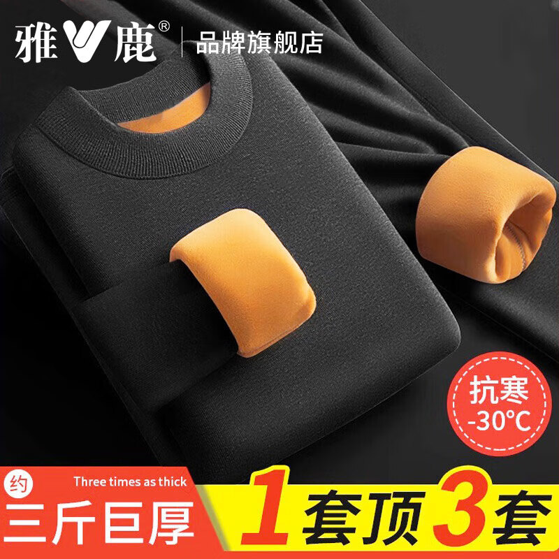 雅鹿保暖内衣男士加厚加绒冬季秋衣秋裤套装圆领防寒巨厚中老年打底衫 黑色-巨厚中领 2XL 建议120-150斤