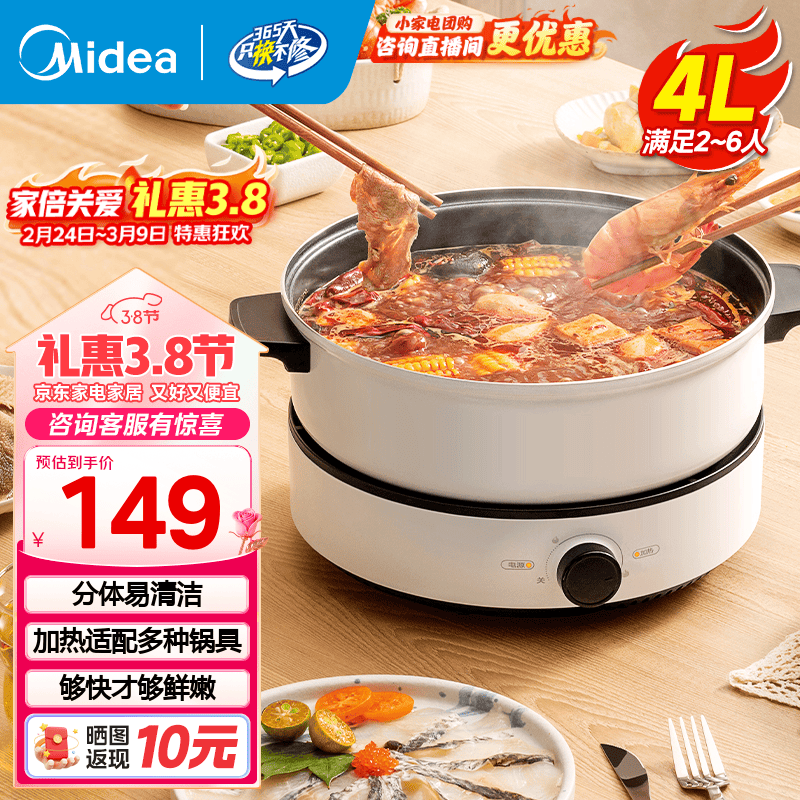 美的(Midea)电火锅 火锅专用锅3-4人 电锅一体家用多功能锅 一锅多用宿舍电煮锅 电热锅分体可拆 4L 【底座可当电磁盘】26easy501
