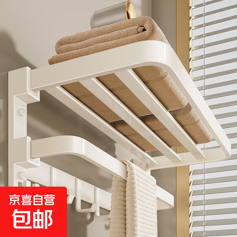 京东物流 白色毛巾架免打孔卫生间浴室置物架壁挂式洗手间浴巾架 【升级双折叠】浴巾架60CM带5钩