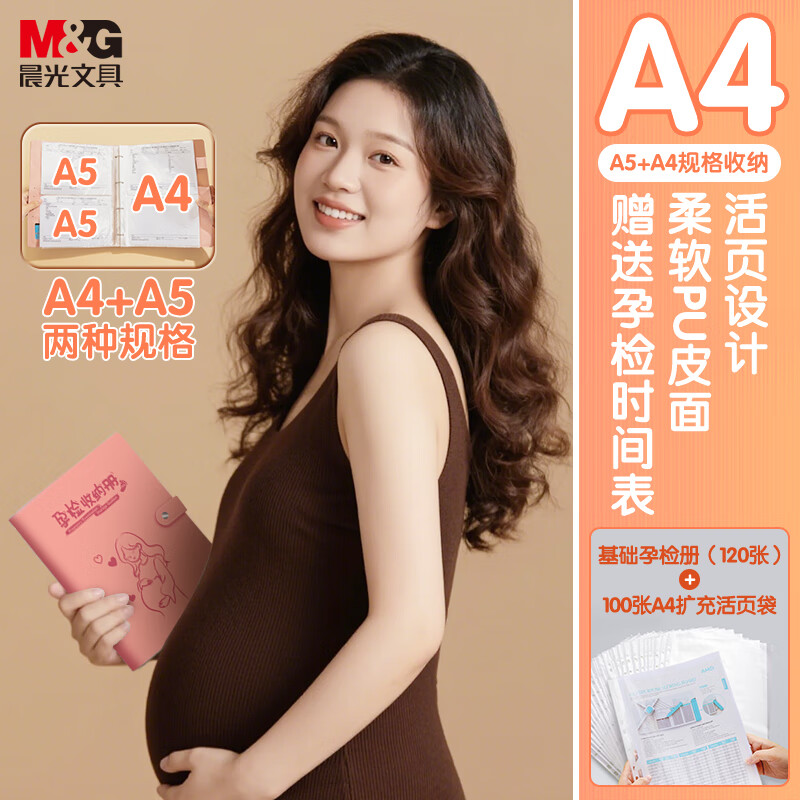晨光产检收纳册孕检报告单孕妈妈资料袋孕期怀孕记录册便携b超a4体检单初樱粉+活页袋补充装100只