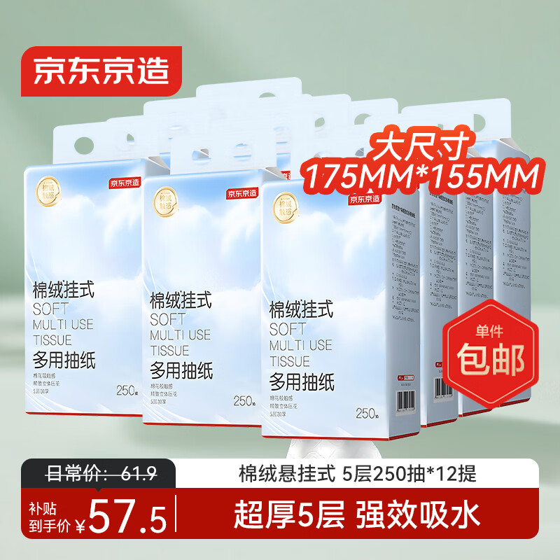 京东京造 棉绒挂抽纸巾悬挂式5层250抽12提餐巾纸厕纸擦手纸京东自营