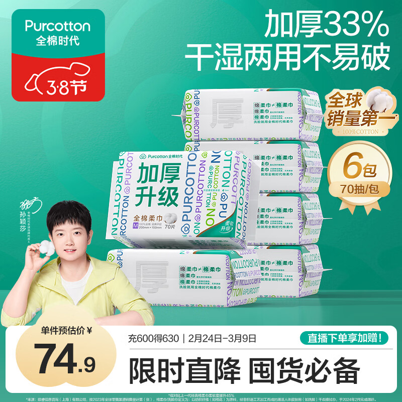 全棉时代【孙颖莎同款】洗脸巾 70抽*6包加厚33%一次性100%棉柔巾15*20CM