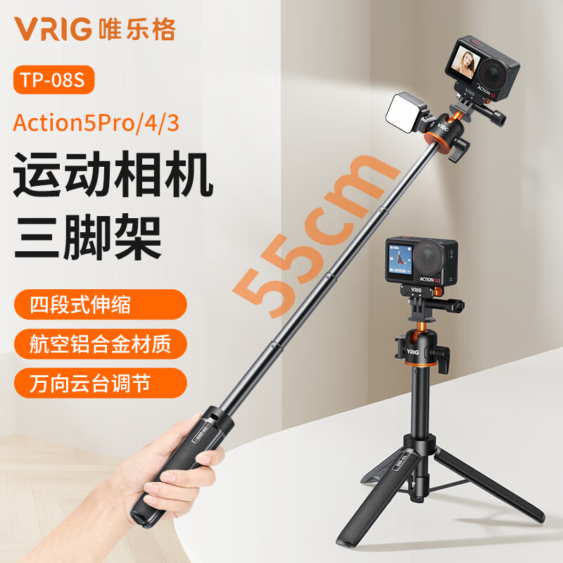 VRIG唯乐格TP-08S大疆Action6/5Pro/4三脚架自拍杆万向云台竖拍运动相机支架Gopro延长杆insta360acepro2配件