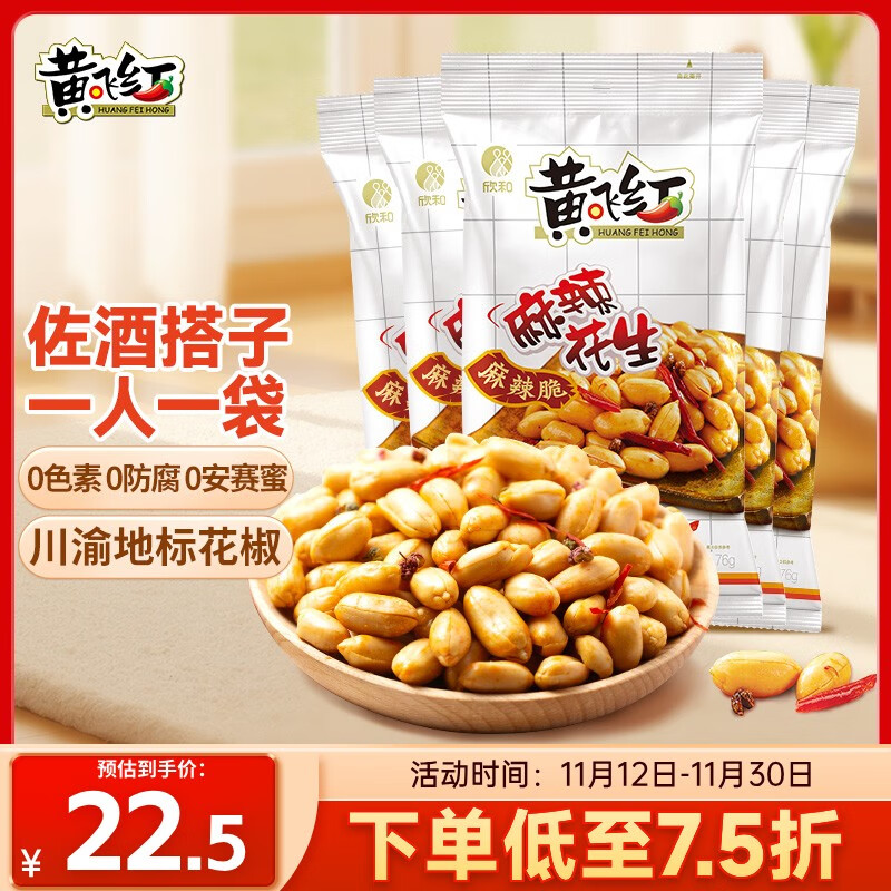 黄飞红(HUANGFEIHONG) 麻辣花生米76g*5袋 休闲零食小吃下酒菜 坚果炒货 脱油花生仁