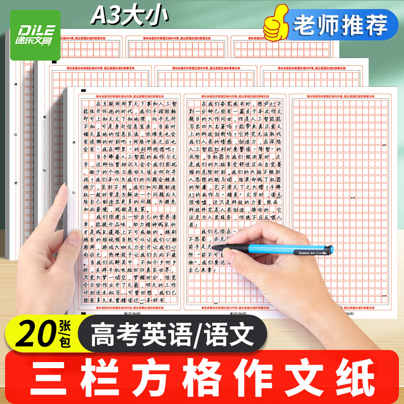 递乐A3三栏方格高考作文纸高考语文作文纸考试专用方格子写作稿纸语文3栏作文答题卡纸20张SZA3020E760