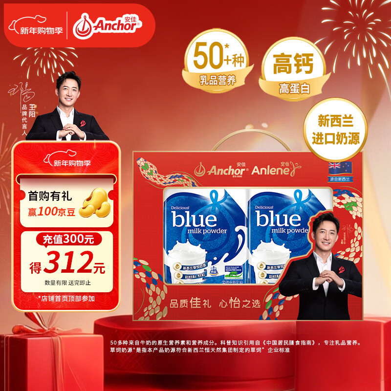安佳(Anchor)高钙全脂奶粉 1KG*2袋 礼盒 成人奶粉 新西兰进口奶源营养早餐