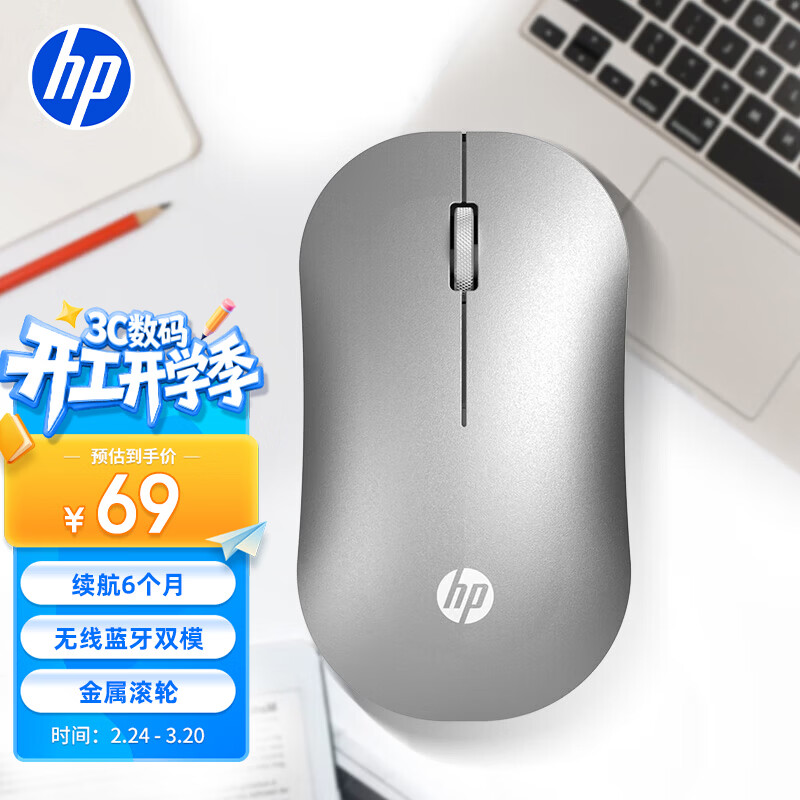 惠普(HP)DM10 无线蓝牙双模鼠标 商务办公无线鼠标苹果笔记本微声蓝牙便携式无线鼠标 银色