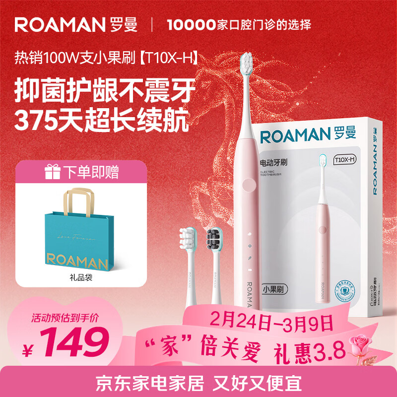 罗曼(ROAMAN)小熊声波电动牙刷抑菌99.9%缓震软毛刷头学生成人女男士生日礼物小果刷T10X-H粉色 375天长续航