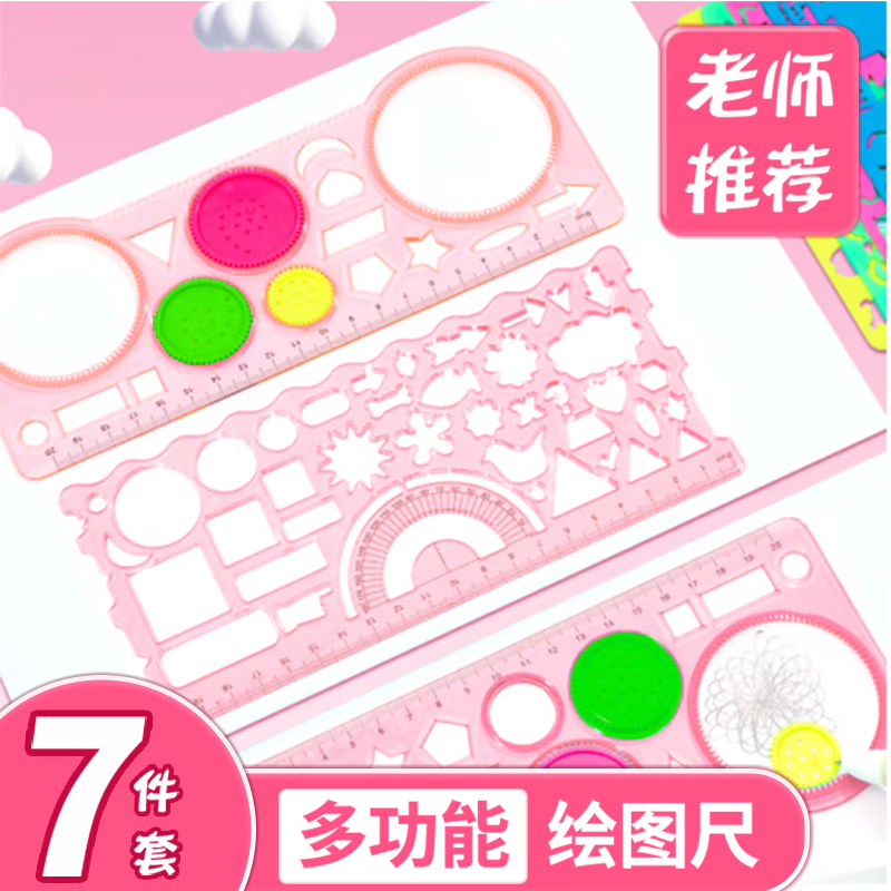 离草 多功能尺子手抄报尺子手抄报神器万花尺尺子小学生模板多功能尺一年级几何数学七件套 粉色