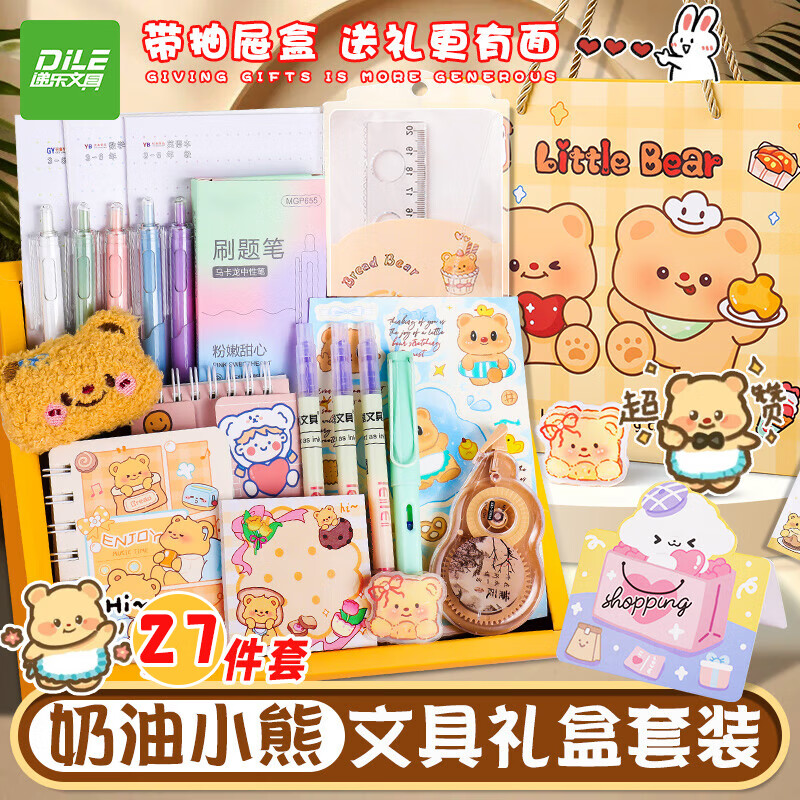 递乐 黄油奶油小熊文具礼盒套装小学生学习用品开学大礼包初中生学习盲盒高年级升级27件套 HY2505