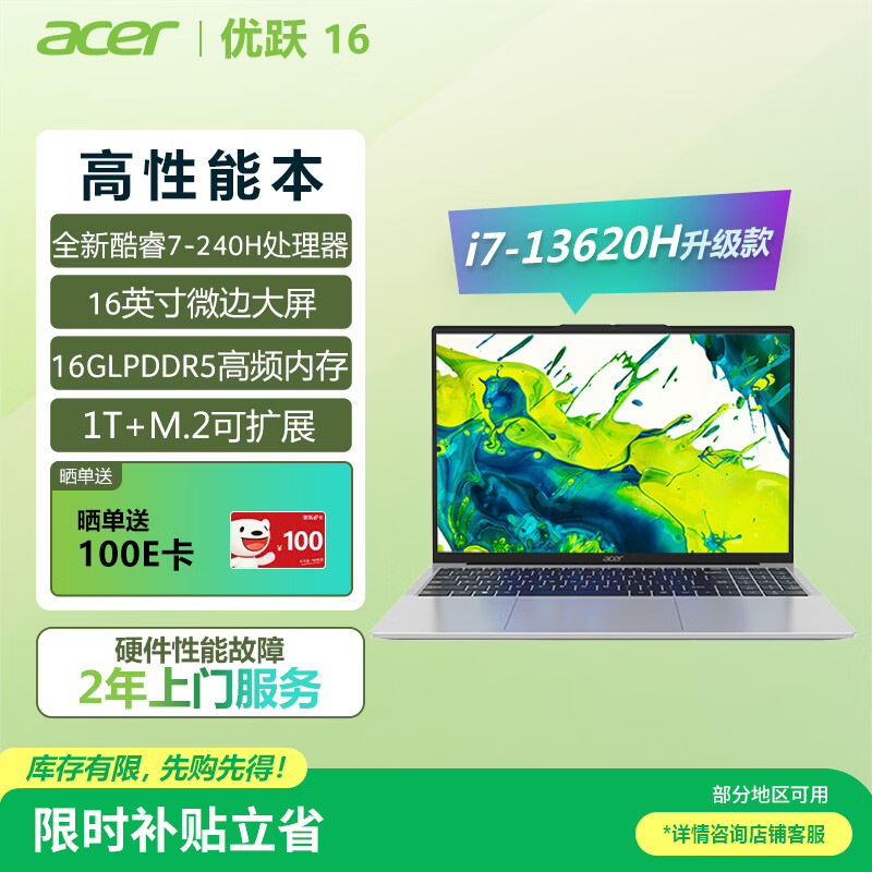 宏碁优跃16笔记本电脑 16英寸高性能大屏学生办公轻薄本(Intel酷睿7-240H 16G 1T 全高清)