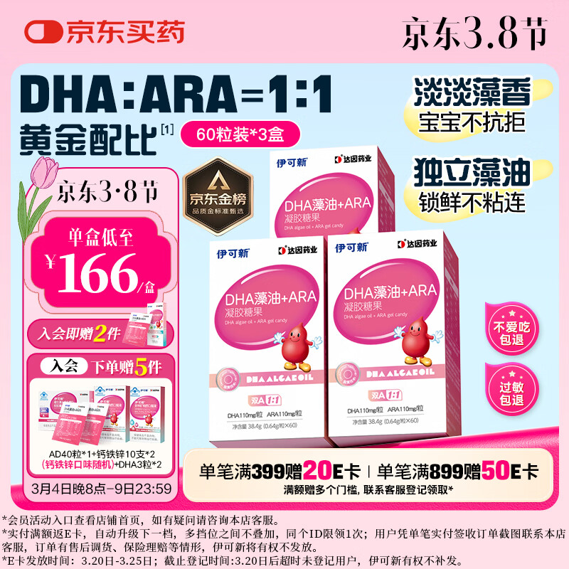 伊可新dha藻油软胶囊含ARA无鱼腥味儿童宝宝学生青少年DHA藻油60粒*3