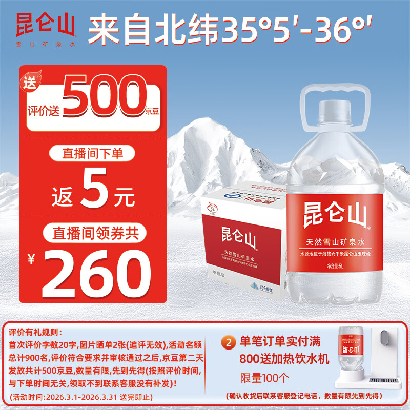 昆仑山 大桶装矿泉水 饮用天然弱碱性 5L*4瓶 整箱装 家庭品质