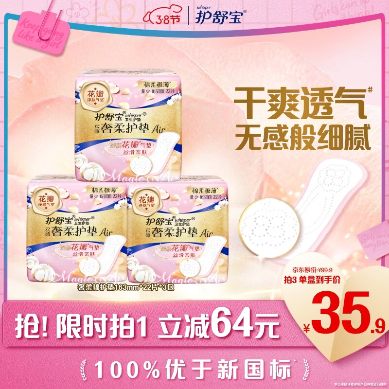 护舒宝奢柔棉气垫卫生巾护垫量少日用163mm66片迷你巾姨妈巾京东自营