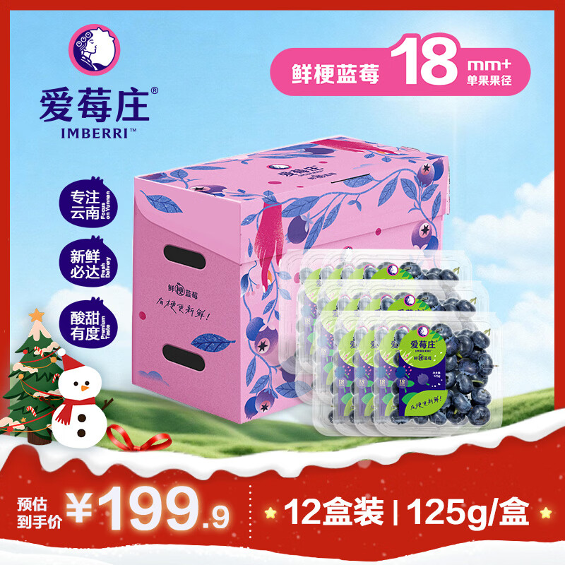 爱莓庄云南鲜梗蓝莓 脆甜新鲜手采现摘 18mm+12 盒装 约125g/盒源头直发