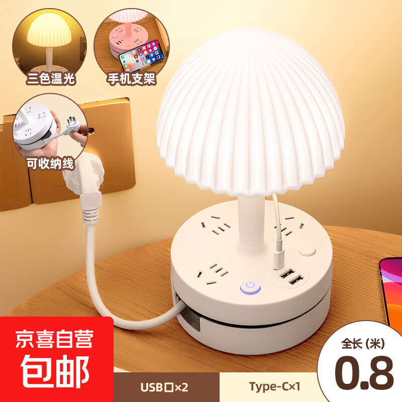 【京东物流】多功能插座家用LED台灯主卧室床头灯插座轻奢小夜灯婴儿喂奶护眼睡眠灯 无暇白【3插位+USB】三色 0.8米