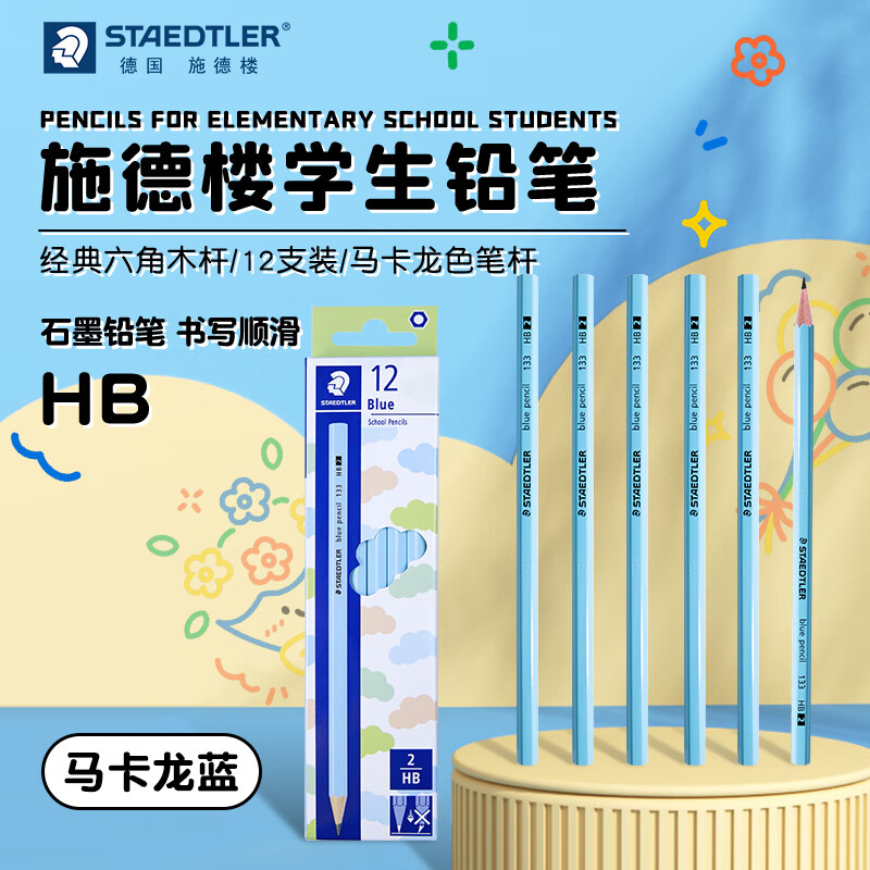 施德楼(STAEDTLER)HB铅笔 经典六角木杆小学生专用考试涂卡学生礼物开学必备12支/盒 马卡龙蓝133-HB-302