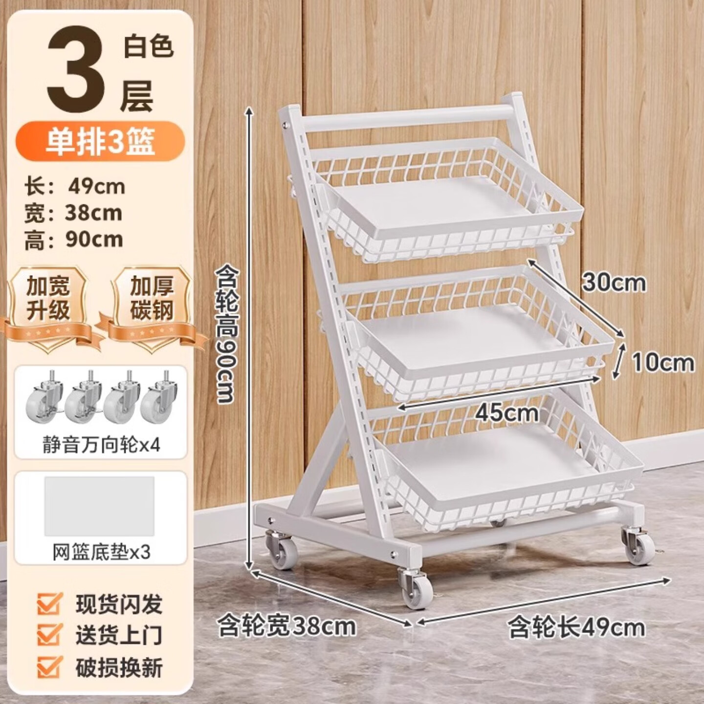 全恋超市生鲜货架落地移动果蔬展示架水果店蔬菜零食斜口篮厨房置物架 【白色加宽款】单排三筐