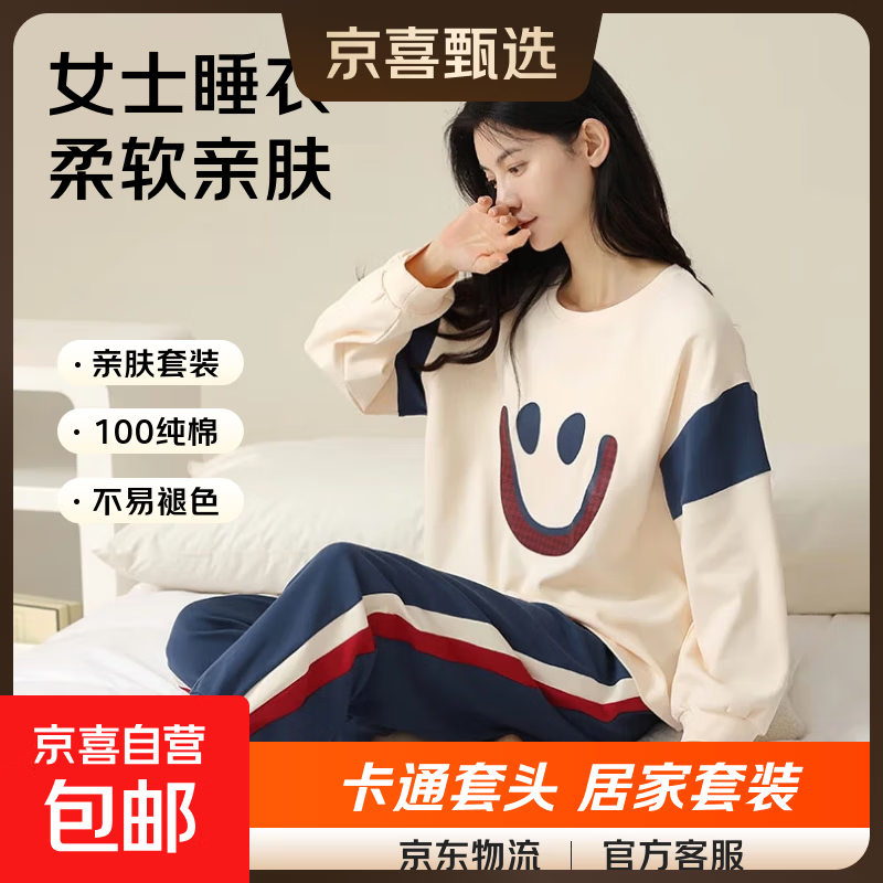 纯棉睡衣女春秋2025年新款爆款可爱卡通可外穿长袖休闲冬天家居服 笑脸-8505 XXL【140-160斤】