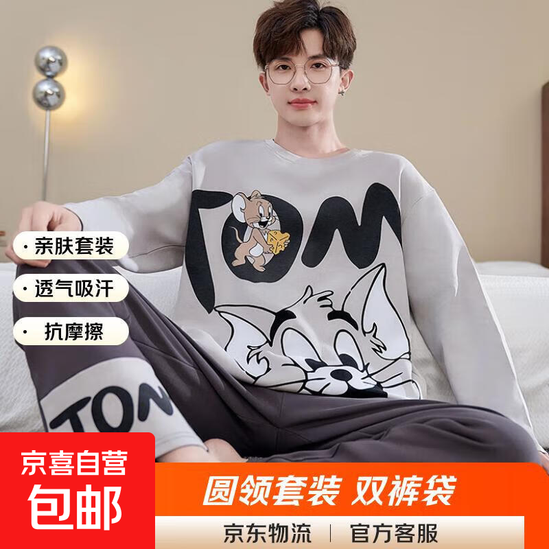 纯棉睡衣男士冬春款2025新款套头青少年秋冬加肥加大码家居服套装 6621灰色汤姆猫 XL 120-140斤