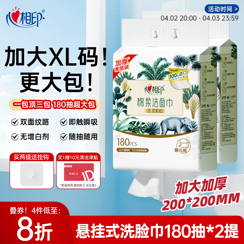 心相印洗脸巾棉柔系列180片*2提 一次性悬挂式擦脸巾 加大加厚 干湿两用